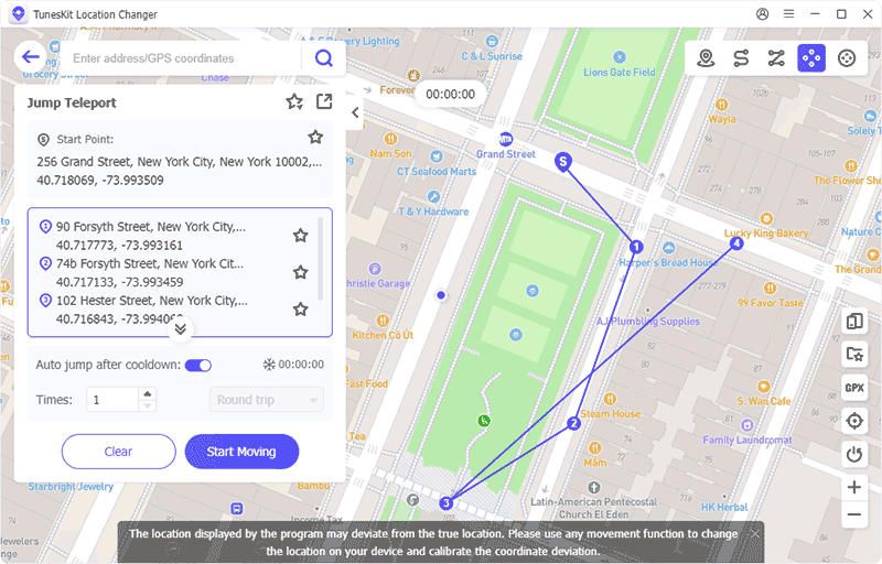 Click on the Jump Teleport icon in the upper-right corner of the map. In the search bar at the upper-left corner, enter your desired location from the drop-down list. Click Start Moving to teleport.